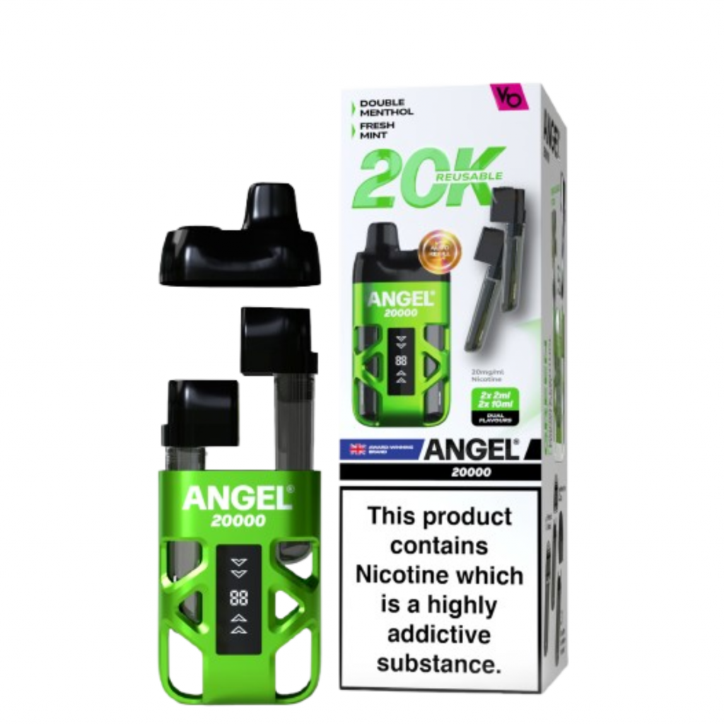 Angel 20K kit provides the same convenience and experience as a disposable vape with a dual flavour system providing upto 20,000 puffs depending on the length of each draw.