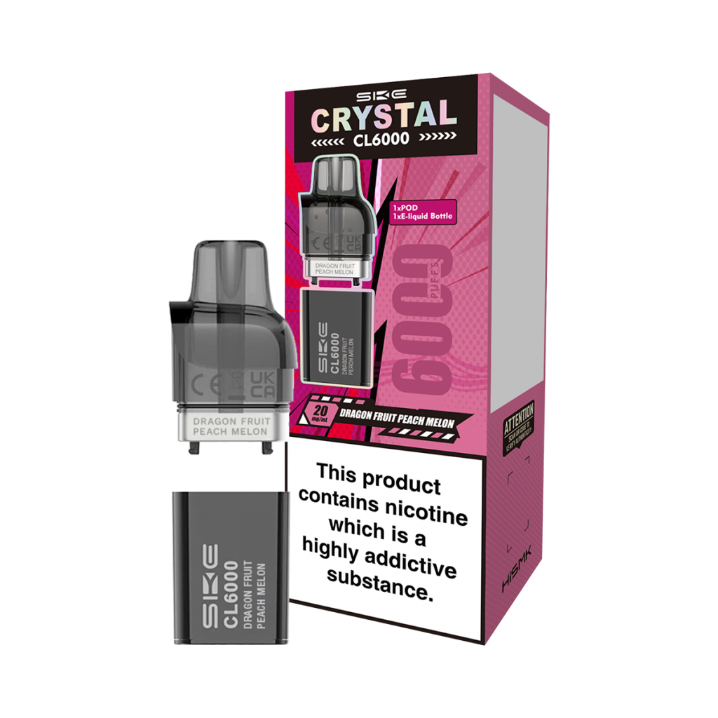 SKE Crystal CL6000 Pods provides a built-in dual mesh coil that has a large surface area – heating up the e-liquid quickly in order to boost flavour. The 2ml pod and 10ml refill container both come prefilled with nic salt e-liquid, which delivers a smooth throat hit while satisfying cravings fast.